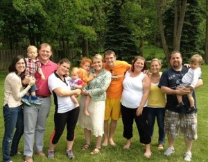 LtoR: My d-i-l Erin and son Frank with their little guy, Frankie; my daughter Grace (with her two red-heads, Rosie & Sophia), me, my son Sam, and daughter Carrie (expecting her 2nd a few weeks) my daughter Hannah, and Carrie’s husband Jason and their son DominicIt began with the arrival of my daughter and grand-girls (who live two-hour away) and a time visiting my parents and celebrating Mothers Day with my mother …topped off by her delicious split pea soup.